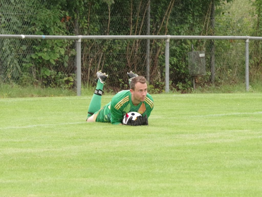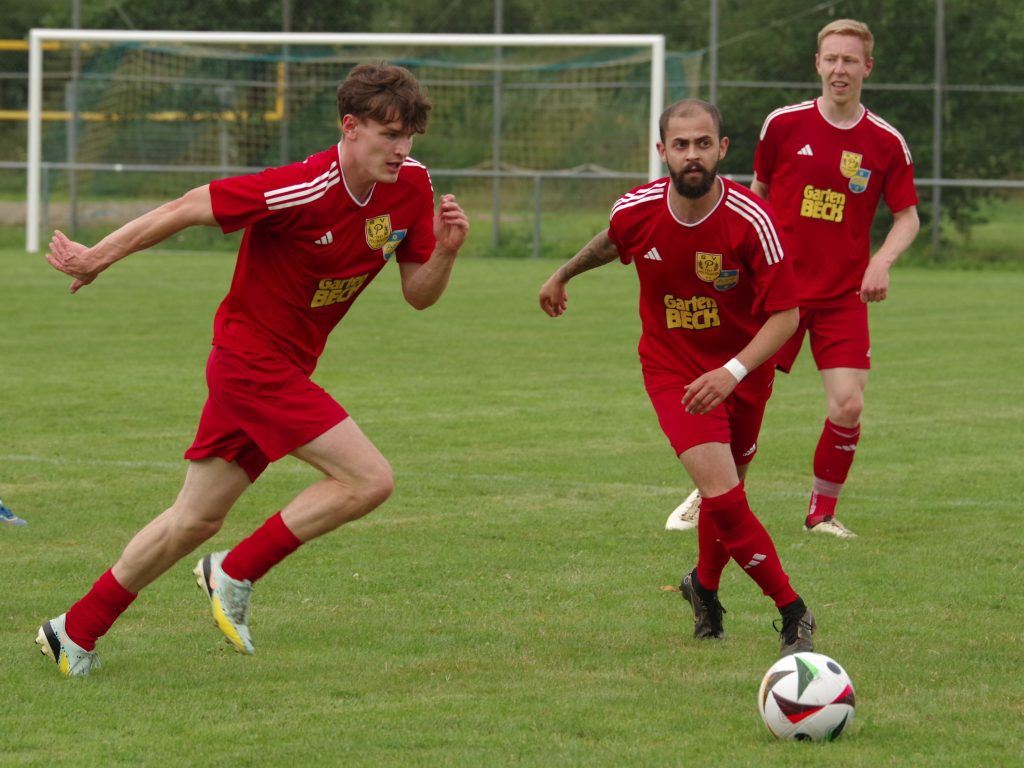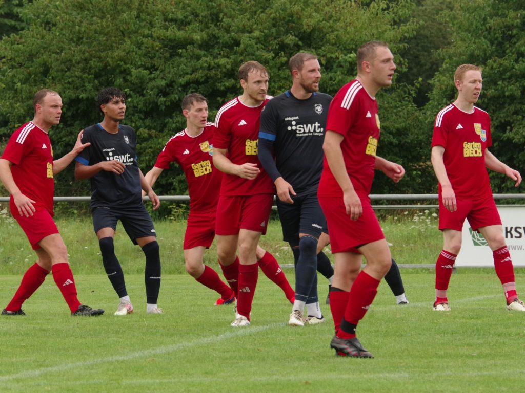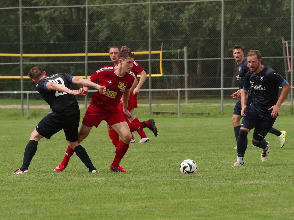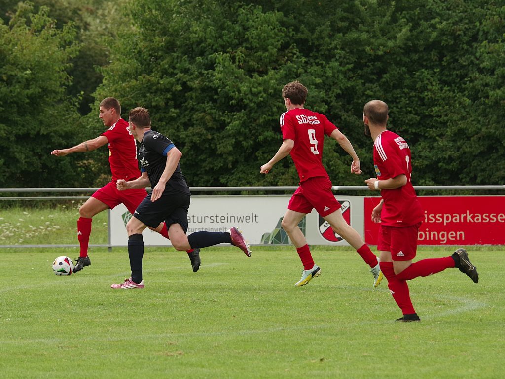 Bevor die neue Saison am kommenden Sonntag mit der 1. Runde des Bezirkspokals startet, testete unsere 1. Mannschaft am vergangenen Samstag gegen den SV Pfrondorf. Auf regennassem Rasen in Pfäffingen entwickelte sich im 1. Abschnitt ein offener Schlagabtausch. Jesse Lechner traf das Außennetz (7.), Tim Göhring scheiterte aus Nahdistanz am Pfrondorfer Keeper Jonathan Wutzler (15.). Davor hatten wir nach einem Vorstoß der Gäste bis zur Grundlinie Glück, dass die Hereingabe an den Außenpfosten abgelenkt wurde (10.). Als zudem eine 25m-Bogenlampe der Pfrondorfer unseren Querbalken küsste, hätten wir uns zu diesem Zeitpunkt nicht über einen Rückstand beschweren dürfen (25.). Danach verflachte die Partie etwas, weil sich beide Teams im Mittelfeld egalisierten und kaum zu Torabschlüssen kamen. Nach dem Seitenwechsel stand Fiore Guido nach einer Ecke von Jesse Lechner völlig frei im 5m-Raum, aber sein Schuss zischte über den Kasten (47.). Stattdessen ging der Bezirksligist per Kopfball nach einem an den langen Pfosten geschlenzten Freistoß in Führung (51.) Fiore Guido hätte den Ausgleich markieren können, als er sich aus 20m ein Herz fasste, aber leider nur den Pfrondorfer Querbalken traf (67.). Das Pech hielt auch noch weiter an: Keeper Pascal Baumgärtner rutschte das Leder nach einem Pfrondorfer Abschluss durch die Finger, so dass die Gäste nach diesem Geschenk etwas schmeichelhaft mit 0:2 in Front lagen (72.). Mike Kittel gab postwendend die richtige Antwort: Er erkämpfte sich die Kugel im Mittelfeld, zog unwiderstehlich in die Box und schloss wuchtig zum verdienten 1:2-Anschlußtreffer ab (73.). Der Ausgleich lag jetzt in der Luft: Der eingewechselte Florian Remmler tankte sich links wunderbar durch, flankte auf den im Zentrum postierten Felix Beeh, aber der Pfrondorfer Keeper Jonathan Wutzler war auf dem Posten (80.). Die Gäste drehten in den Schlussminuten nochmal auf, trafen unseren Außenpfosten (81.) und machten in der Schlussminute mit einem Schuss aus spitzem Winkel zum 1:3 endgültig den Deckel auf diese Partie (90.). Die Niederlage fiel am Ende etwas zu hoch aus, denn wir haben gegen den Bezirksligisten über weite Strecken auf Augenhöhe agiert.