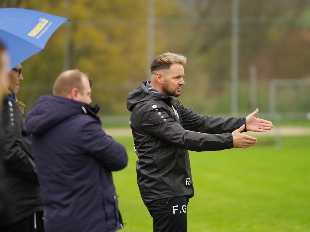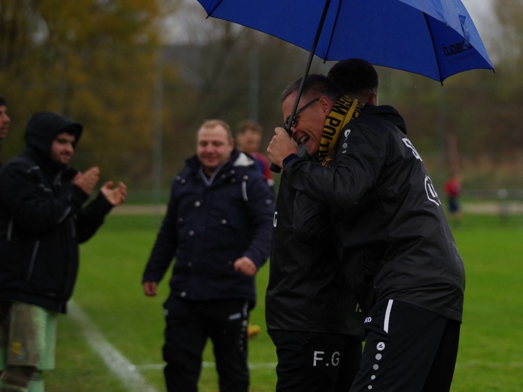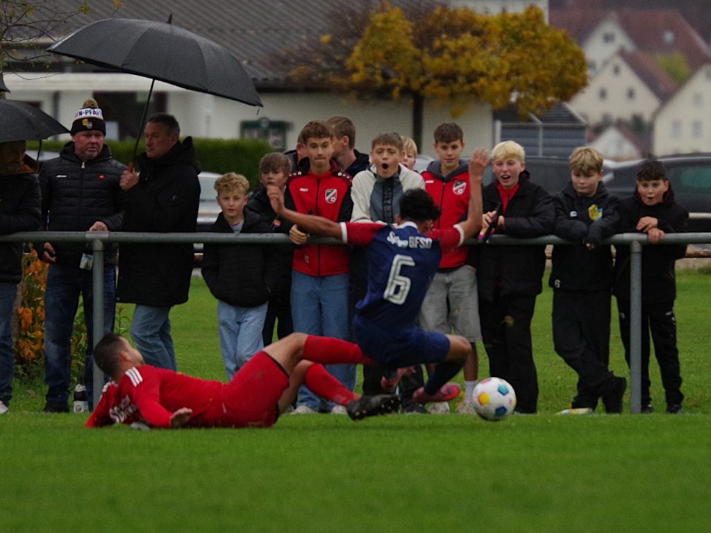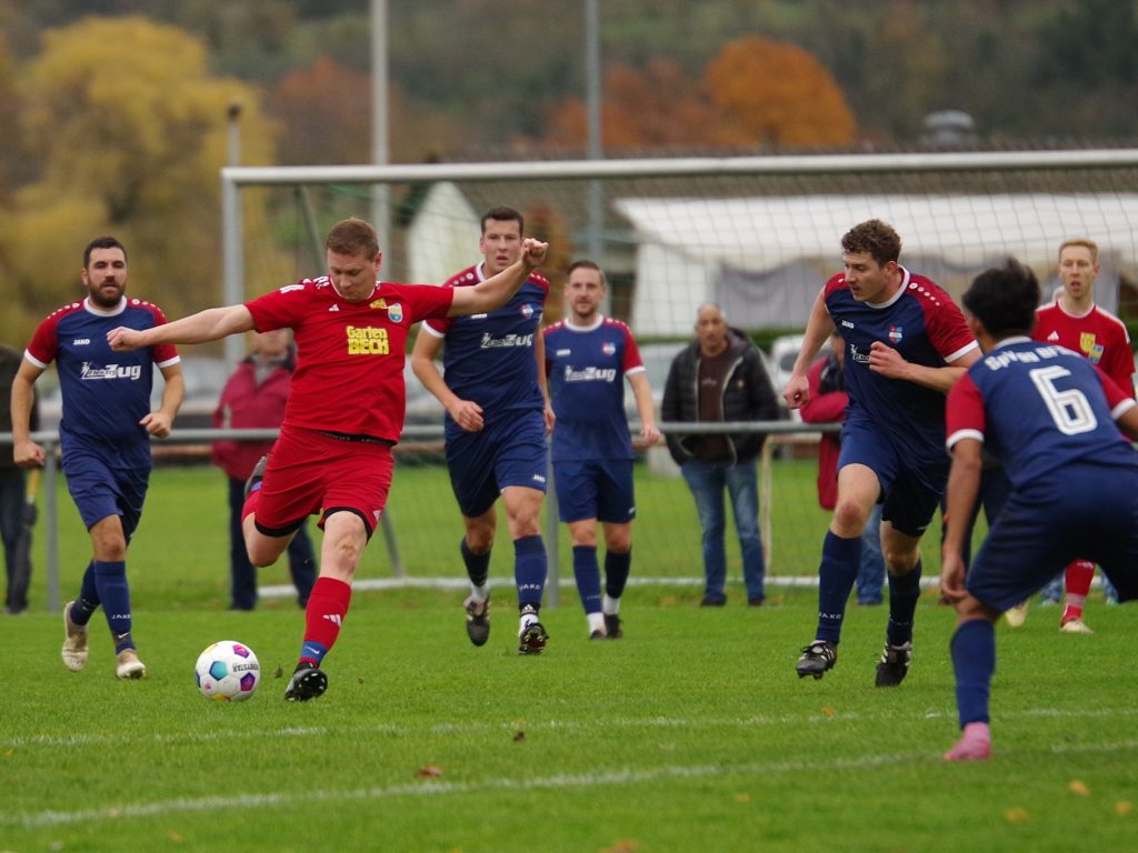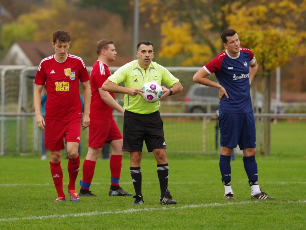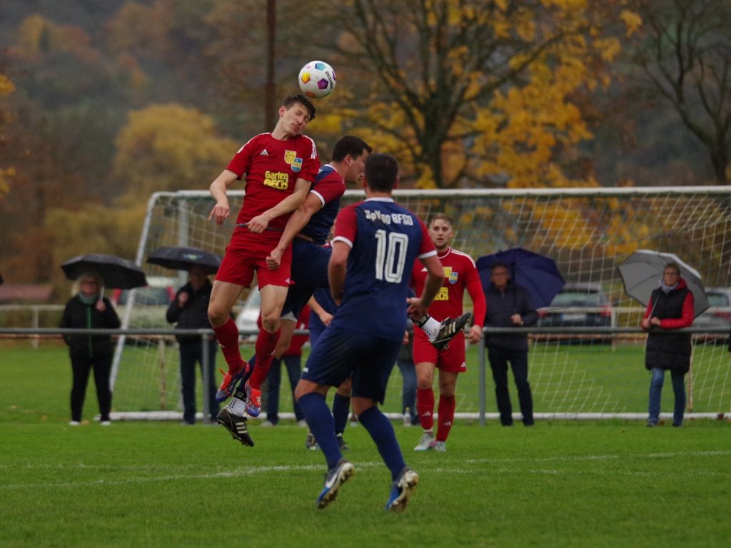 Zunächst lief für uns alles nach Plan: Ein Angriff wie aus dem Lehrbuch führte schon nach 5 Minuten zur 1:0-Führung. Mike Mozer erkämpfte im Mittelfeld den Ball, passte zu Alex Norz auf die rechte Außenbahn, dessen Flanke Alexander Beck per Kopf in die Maschen setzte. Wahrscheinlich dachten wir, dass gegen den Tabellenvorletzten alles von alleine laufen würde, denn uns fehlte danach komplett die Galligkeit in den Zweikämpfen, so dass BFSO besser in Spiel kam. Benjamin Narr flankte, Nicolas Zettel ließ durch, so dass Marius Ulmer im Zentrum völlig frei zum Abschluss kam, aber knapp verzog (12.). Auch nach diesem Warnschuss wachten wir nicht auf. Markus Bauer steckte auf Emil Hartmann durch, der unseren Keeper Pascal Baumgärtner zu einem Klasse-Reflex zwang, bevor Jan Rebmann im Nachschuss das leere Tor nicht traf (22.). Der Ausgleich lag förmlich in der Luft und fiel dann auch. Max Beuter setzte sich auf der linken Außenbahn durch, passte in den Lauf von Benjamin Narr, der trocken unten links zum 1:1-Ausgleich abschloss (27.). Bloß gut, dass unser Goalgetter Alex Norz praktisch im Gegenzug für die erneute Führung sorgte, als er aus 20m einfach mal abzog. BFSO-Keeper Dominik Saile war zwar noch mit den Fingerspitzen dran, aber die Kugel sprang vom Innenpfosten ins Tor (28.). Es blieb im Regen von Pfäffingen weiter eine zähe Angelegenheit, aber die Halbzeitansprache von Jörg Eyth und Fabian Grammer zeigte Wirkung. Nach dem Seitenwechsel kamen unsere Bälle endlich an, wir machten das Spiel breit und wurden offensiv gefährlicher. Ein weiter Abschlag von Pascal Baumgärtner landete links bei Alex Norz, der mit viel Übersicht auf Jesse Lechner zurücklegte. Dessen Schuss aus 25m war lange in der Luft und senkte sich hinter Dominik Saile zum 3:1 hinter die Linie (53.). Nur 5 Minuten später dann die Vorentscheidung: Stefan Göhring passte das Leder aus dem Mittelfeld in den Lauf von Marcel Schmid, der auf dem linken Flügel aus spitzem Winkel zum 4:1 traf (58.) – jetzt gelang uns plötzlich alles! Der Torschütze sammelte wenig später noch einen Assist mit seinem Pass auf Alex Norz, der mit seinem Doppelpack zum 5:1 für den Endstand sorgte (62.). Nach diesen furiosen 10 Minuten spielten wir die Partie seriös zu Ende. Der eingewechselte Felix Beeh war nah an seinem Premierentreffer, als er einen Flugkopfball nach Flanke von Jesse Lechner knapp über den Querbalken setzte (80.). Am Ende fragte sich unser Anhang, warum wir nicht von Anfang an so gespielt haben, aber letztlich war es aufgrund der deutlichen Leistungssteigerung in der 2. Hälfte ein verdienter Heimsieg, mit dem wir den 3. Tabellenplatz verteidigen.