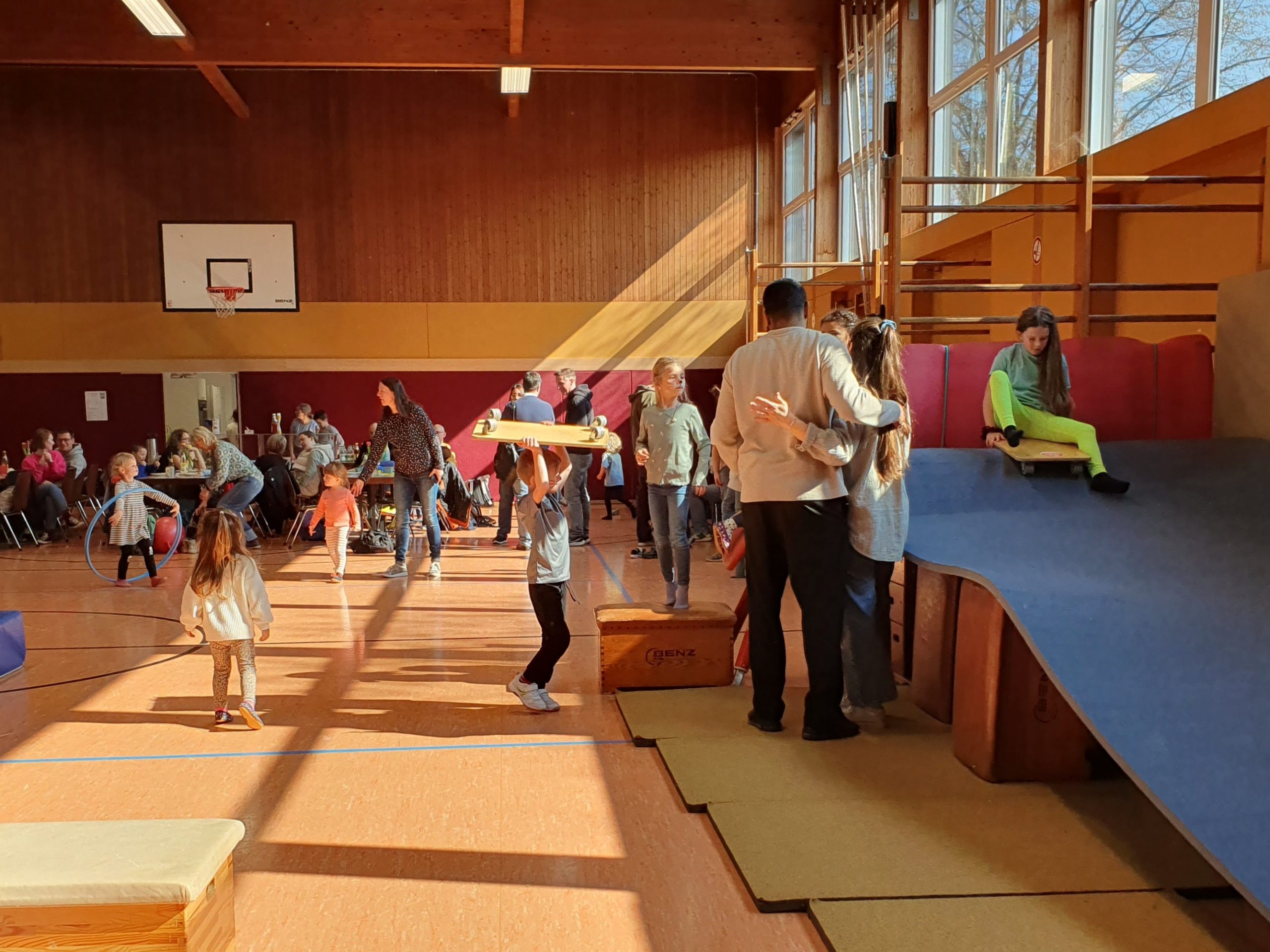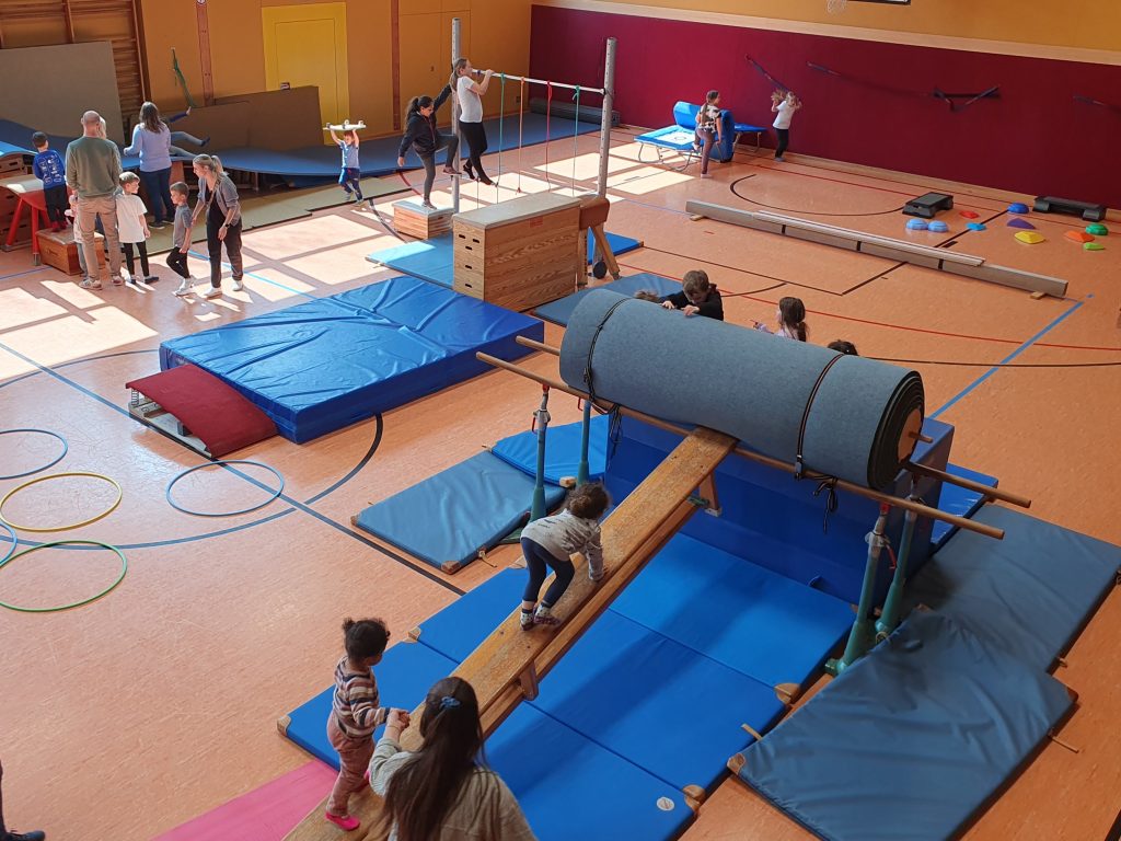 Nach einer kurzen Umbauphase hatte sich die Turnhalle dann in eine tolle Bewegungslandschaft gewandelt. Nahezu alle Turngeräte wurden von den Trainierinnen verbaut um so den Kids spielerisch z.B. das Balancieren, Zielen, Klettern und Rutschen näher zu bringen.