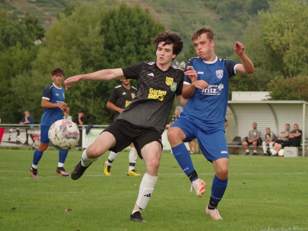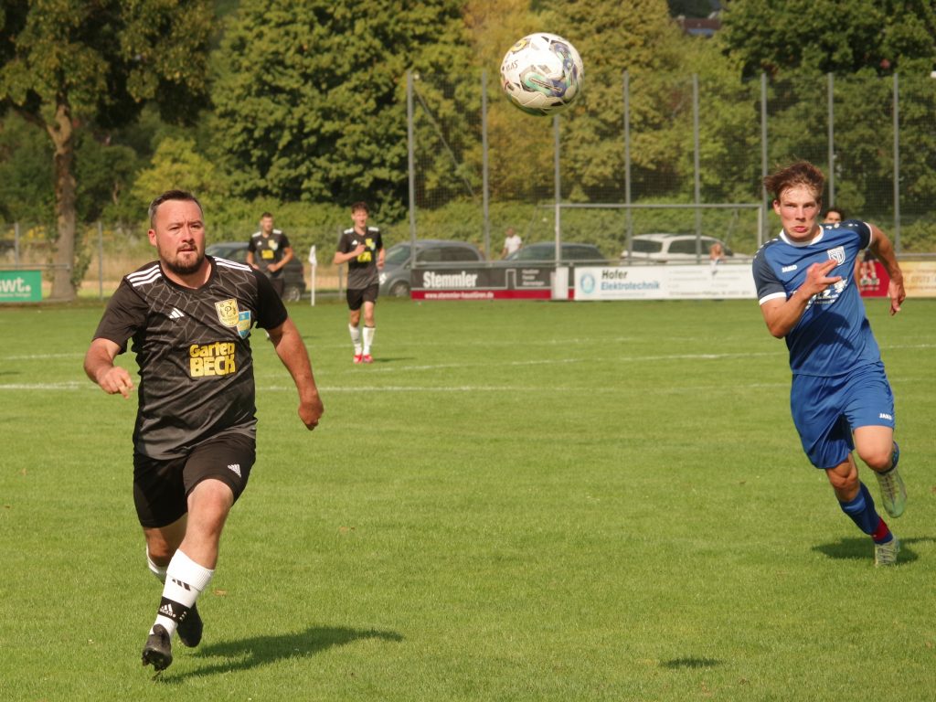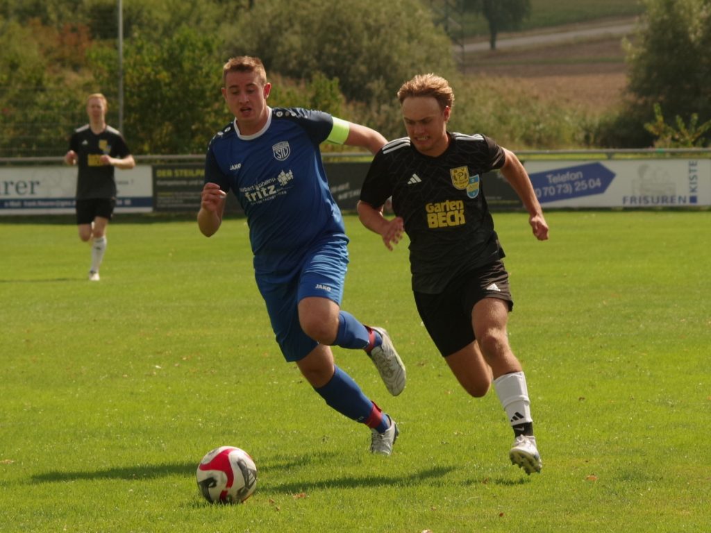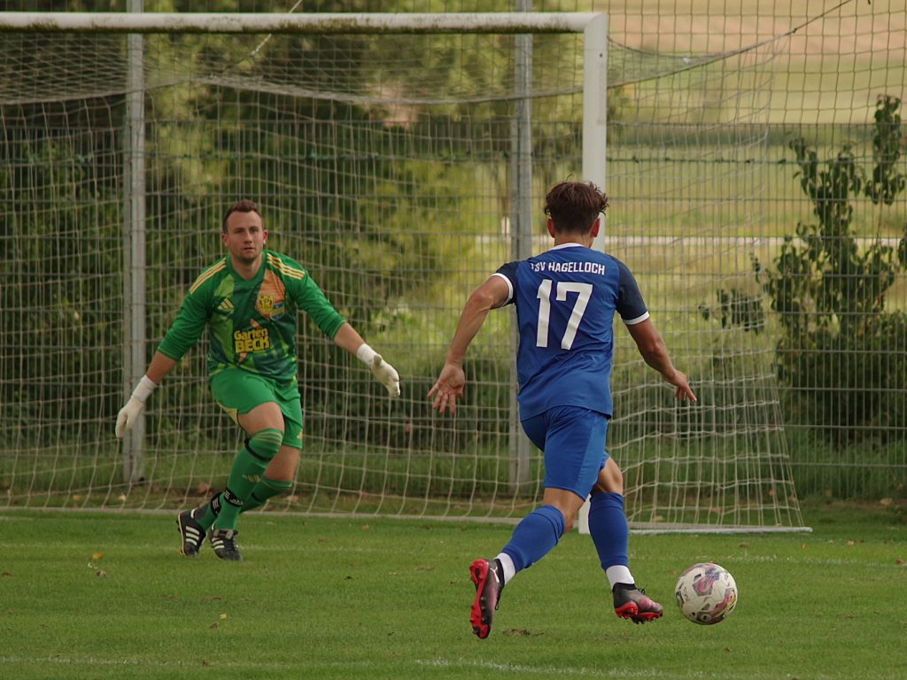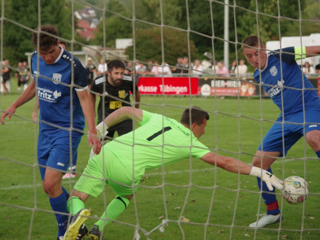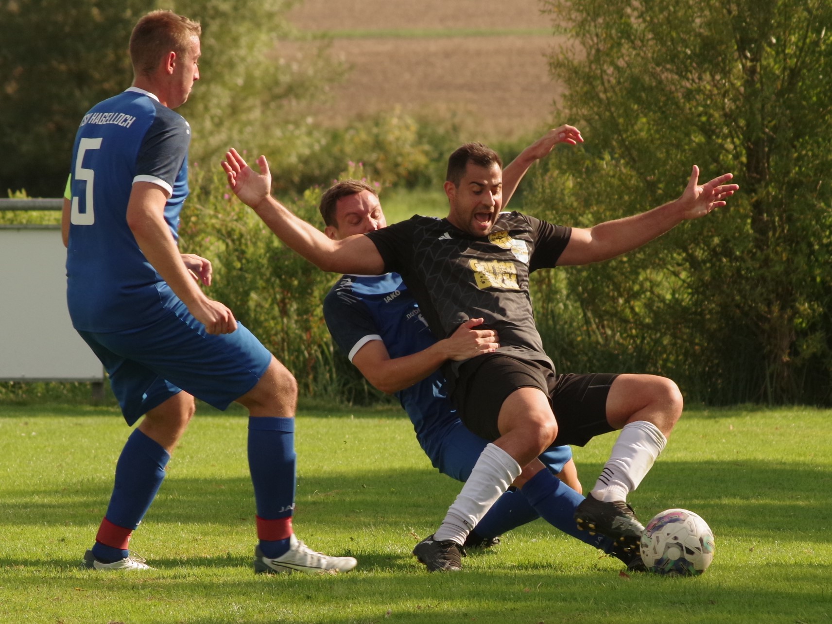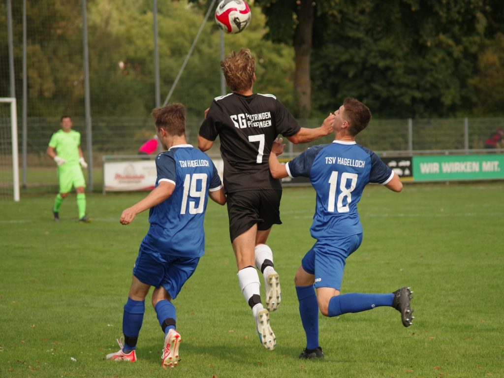 Nach einer halben Stunde hatte wohl niemand unter den etwa 300 Zuschauern geglaubt, dass dieses Spiel noch ein echter Derby-Fight werden würde. Wir konnten bis zu diesem Zeitpunkt im Mittelfeld schalten und walten, dominierten die Partie nach Belieben und lagen bereits mit 2:0 durch einen Doppelpack von Mike Kittel in Front. Nur 40 Sekunden nach dem Anpfiff versenkte er eine Flanke von Fiore Guido zum 1:0 (1.) und wenig später einen Pass von Lukas Hartmann zum 2:0 (10.). Eine umstrittene Entscheidung gab der Partie jedoch eine ungeahnte Wendung. Moritz Batte ergatterte einen zu kurz geratenen Rückpass der Gastgeber, lief auf seinen ehemaligen A-Jugend-Mitspieler Jakob Hölle als letzten Abwehrmann zu und kam zu Fall – Schiedsrichter Armin Sigler zeigte die Rote Karte (30.). In Unterzahl spielte Hagelloch/Unterjesingen plötzlich Fußball und brachte uns gehörig in Schwierigkeiten. Ein Schuss aus der Drehung von Janick Speth landete noch knapp rechts über dem Kasten (34.), aber wenig später traf Julian Wehner nach Vorarbeit von Matthias Loy ins lange Eck zum 2:1-Anschlußtreffer (39.). Auch nach dem Seitenwechsel witterten die Gastgeber ihre Chance. Mittelfeld-Motor Max Leibfahrt war jetzt kaum noch zu stoppen – spielten wir wirklich in Überzahl? Matthias Loy hatte per Kopf die Riesen-Chance zum Ausgleich, aber unser Keeper Pascal Baumgärtner parierte (53.). In einer zunehmend hitzigen Atmosphäre brauchten wir unbedingt das dritte Tor: Der aktuell in bestechender Form agierende Jesse Lechner beruhigte die Nerven aller Gäste-Fans und nagelte die Kugel aus kurzer Distanz zum 3:1 unter die Querlatte (56.) – und sorgte damit wieder für mehr Spielkontrolle. Unser eingewechselter Routinier Patrick Walter prüfte Keeper Timo Drescher mit einem 20m-Knaller (73.), bevor wir uns durch die Gelb-Rote Karte für Stefan Göhring wieder in gefährliches Fahrwasser begaben (77.). Der darauffolgende Freistoß wurde von Keeper Timo Drescher aus der eigenen Hälfte nach vorne geschlagen, wo Julian Wehners Schuss vom Innenpfosten ins Tor sprang (79.). Sein Doppelpack zum 3:2-Anschlußtreffer sorgte nun endgültig für hektisches Treiben auf beiden Seiten. Glück für uns, dass der eingewechselte Lion Rittsteiger aus 5m das leere Tor nicht traf (83.), bevor Malte Stauß als letzter Mann gerade noch retten konnte (88.). Die wilde Schlussphase war nichts für schwache Nerven. Wir kassierten in der Nachspielzeit noch weitere 4 Gelbe Karten von Schiedsrichter Armin Sigler, dem aus unserer Sicht das Fingerspitzengefühl für diese Partie fehlte. Mit vereinten Kräften verteidigten wir hinten alles weg und sicherten am Ende den 3:2-Sieg gegen eine aufopferungsvoll kämpfende SGM Hagelloch/Unterjesingen, die sich trotz des frühen Rückstands und der zwischenzeitlichen Unterzahl nie aufgab und uns alles abverlangte, was in einem Derby gefordert ist.